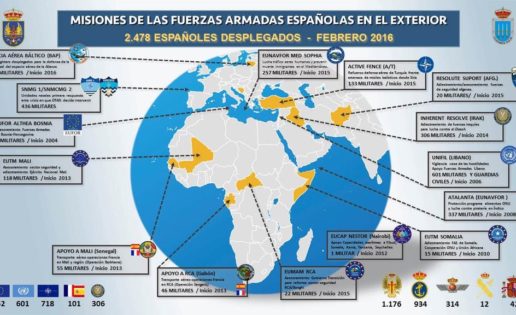 Las Fuerzas Armadas mantienen actualmente 2.478 militares en 15 misiones en el exterior, según informó esta mañana el Estado Mayor de la Defensa (Emad) en una jornada de actualización con los medios de comunicación. De esa cifra, 752 se encuentran bajo bandera de la UE, 718 con la OTAN, 601 con la ONU, 306 en la coalición internacional anti-Daesh en Irak y 101 en misión bilateral con Francia (los dos destacamentos aéreos que España mantiene en Gabón y Senegal).
