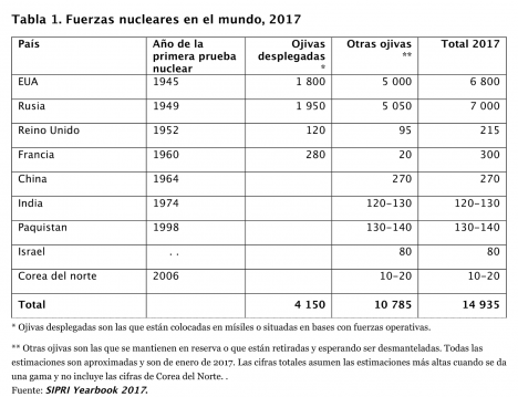 Como titular valga este dato:Â nueve paÃses cuentan en estos momentos con 14.935 cabezas nucleares, frente a las 15.395 de 2016.