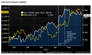 Y es que la moneda única se está negociando como una divisa con muy alta Beta, es decir más volátil que la media del mercado,  y muy correlacionada más directamente con el mercado de acciones. En un entorno de bajo rendimiento, de bajas” yields” a nivel mundial, los mercados de capitales parecen más atraÃdos por las acciones en general y el Euro se ha beneficiado probablemente de una entrada de capitales sin cobertura en la zona Euro, siendo vulnerable a una corrección en el mercado de acciones. Si se activa el modo risk on se es probable ver en las próximas semanas la venta del Euro, aunque ni el bajista más irredento del lugar sueña ya con la paridad del EUR/USD. No obstante, si corrige el mercado de acciones europeo, es posible ver una corrección más baja en el Euro, a pesar de la mejora de las perspectivas económicas y polÃticas. Sólo hacer falta mirar este cuadro de Bloomberg para ver la correlación ahora mismo entre indices europeos y Euro.