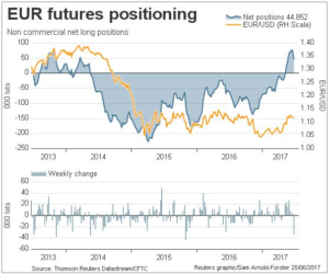 Según el Comittments of Trade, el informe semanal de cómo están posicionados los especuladores de futuros, Los traders aumentaron sus posiciones largas netas en el euro en las últimas ocho semanas, llegando a haber 74000 contratos, aunque esta semana bajaron a 44.000, primer semana de descenso en las últimas ocho, como se puede ver en el gráfico de abajo. Las posiciones largas de futuros en el Euro son superiores a las cortas.